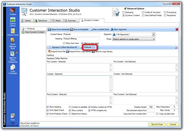Dynamic content allows for editable and non‐editable content choices to be presented during the campaign execution process.