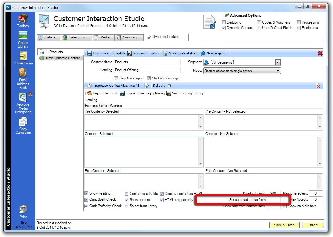 These will be copied into the “Content – Selected” input boxes on each of the dynamic content options we are setting up.