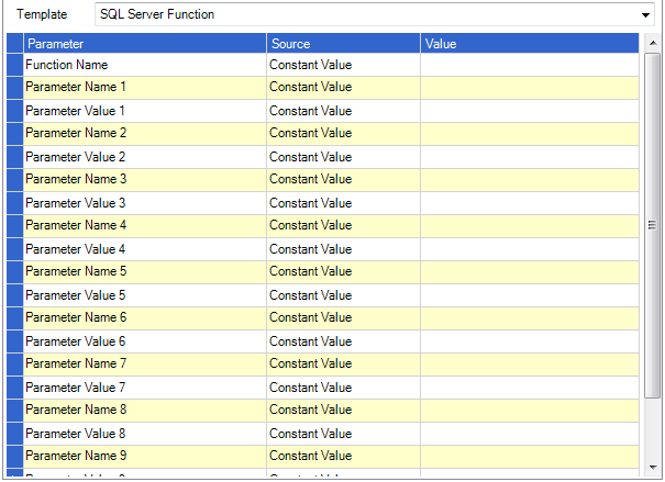 This will return a value from a system or custom sql server function. The function name should be entered in the following format { Schema }.{ Function Name } for example dbo.MySampleFunction. Up to 10 parameters can also be specified through the name/value pairs.