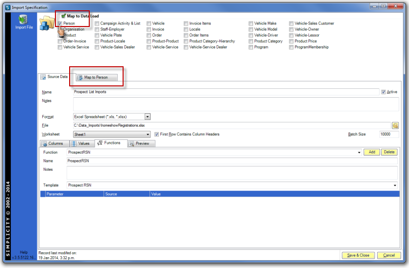 After all functions have been added to the import spec select the appropriate entity data load table(s) under Map to Data Load in the top right of the Import Specification workspace. The number of options available will depend on the number of entities and relationship tables you have in your database.