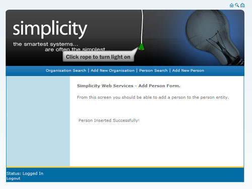 The newly added person is now in the Simplicity Database and can then be accessed through the Web Services, or the Desktop eqivilent.