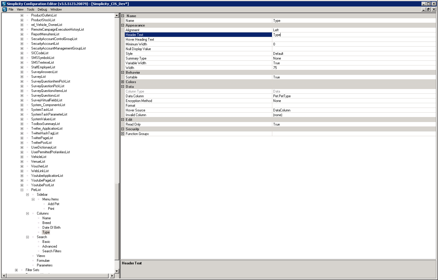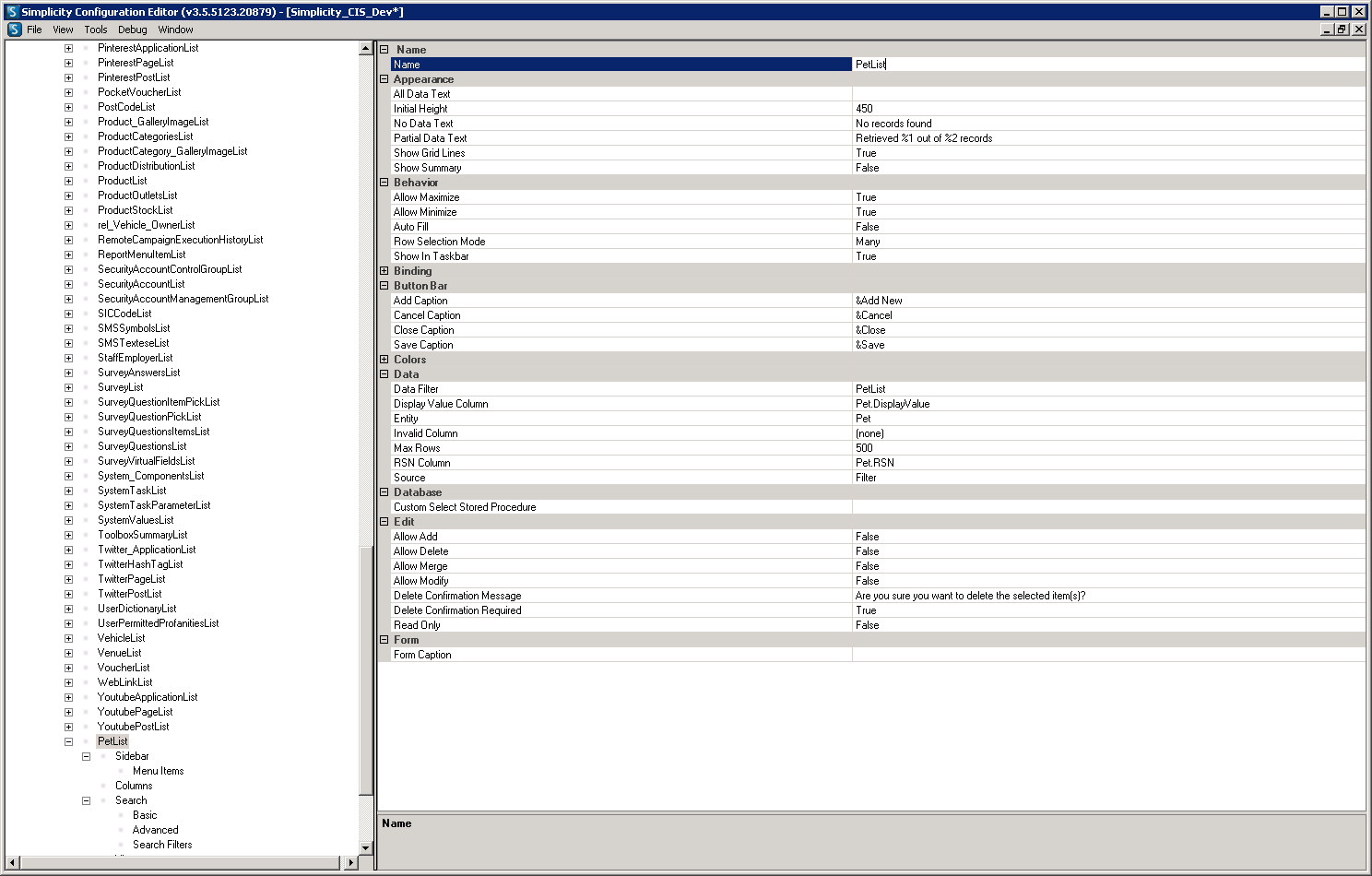 The following walk through takes you through the process of creating a list filter set using the example of a pet entity. These are used to define filters that can be used when navigating to find pick lists.