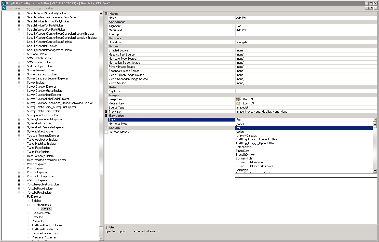 The following walk through takes you through the process of adding entities using the example of adding a pet entity.